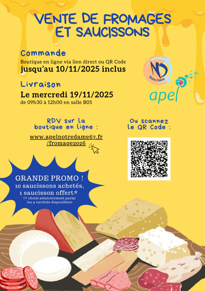 L’APEL organise sa traditionnelle vente de fromages avec cette année en plus 9 sortes de saucissons !